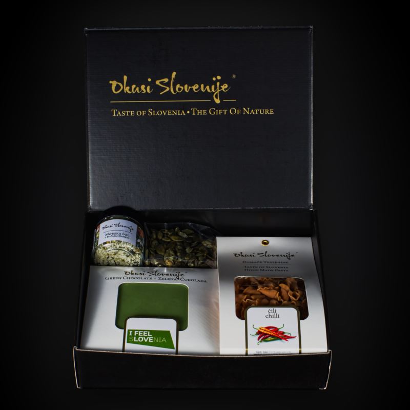 The package contains three chocolates 3x90g, barbecue salt 90g, a bag of salted roasted pumpkin seeds 100g, pasta 200g.