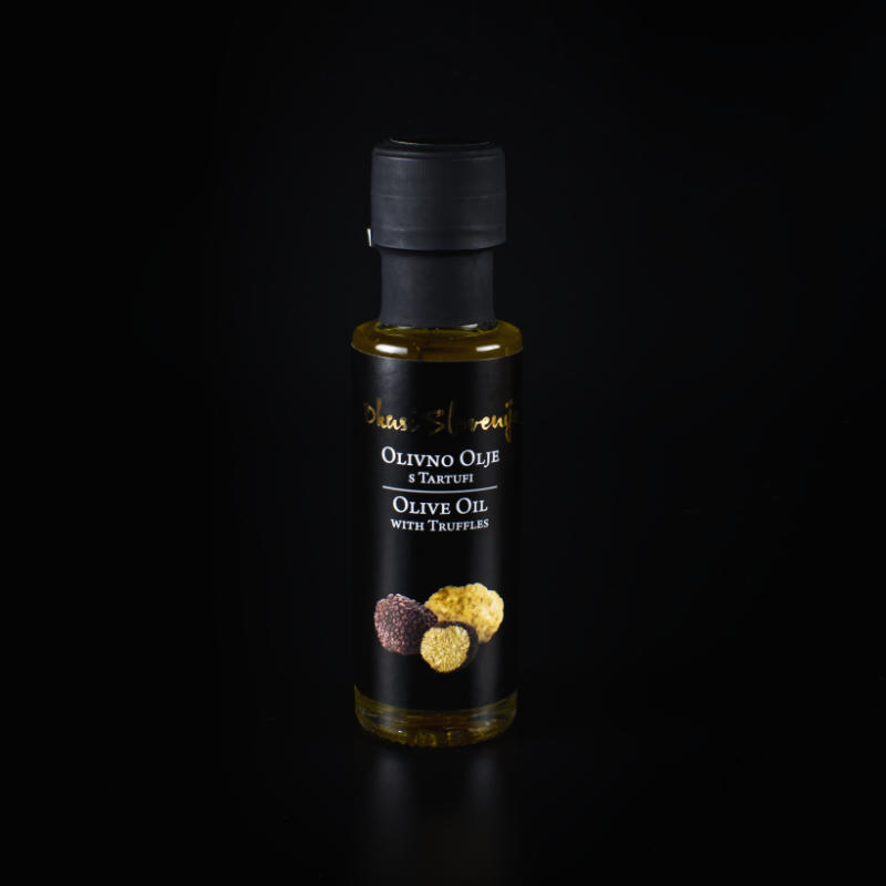 Ekstra deviško slovensko olivno olje s koščki tartufa je odlično dopolnilo številnim omakam, zlasti smetanovi. 100 ml.